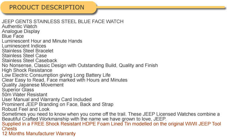 JEEP AUTHENTIC GENTS BLUE STAINLESS STEEL WATCH - BRAND NEW WITH GUARANTEE!!!