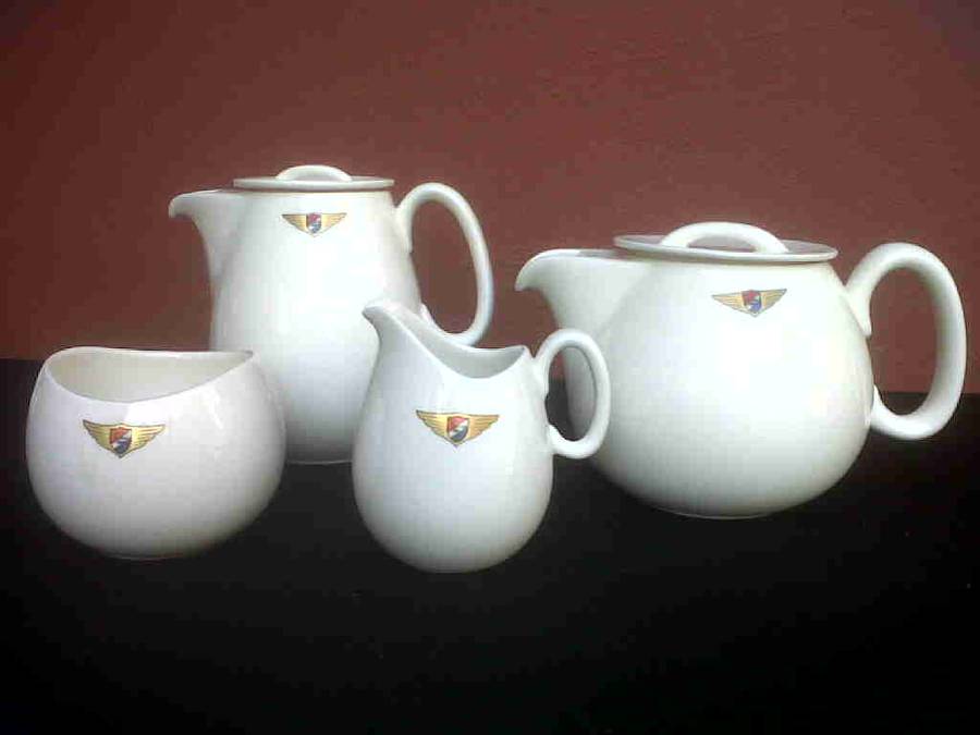 JERGENS CARAVAN CROCKERY. COFFEE POT, TEA POT, SUGAR BOWL AND CREAMER. ALL IN VERY GOOD CONDITION. NO CHIPS OR CRACKS.