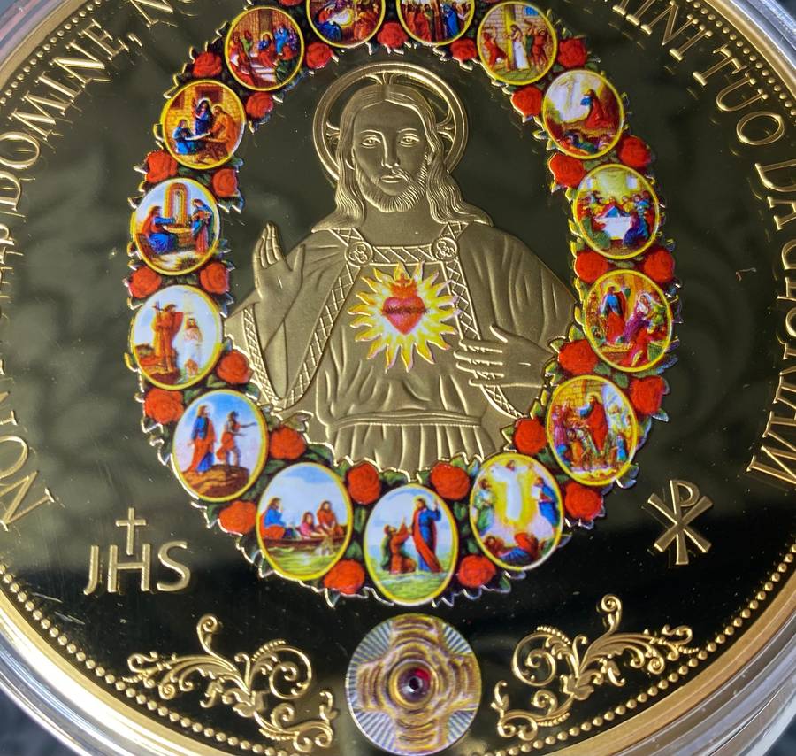 🌟 A breathtaking tribute to the Holy Trinity, this extra-large 100mm proof coin is richly gold-plated and beautifully pad-printed, featuring a genuine Swarovski crystal for a radiant touch.