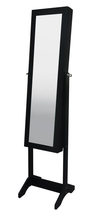 This jewelry armoire with mirror has various hooks, trays and clipboards to accommodate a large range of jewelry. When the door is closed this beautiful piece of furniture is a standing mirror. This standing mirror is made of MDF and the inside is covered with soft fabric.