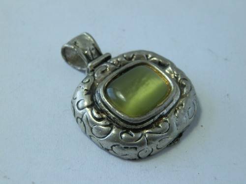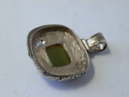 Silver metal pendant with a green stone, no markings, size 2.9 x 3.7 cm and in good condition.