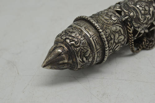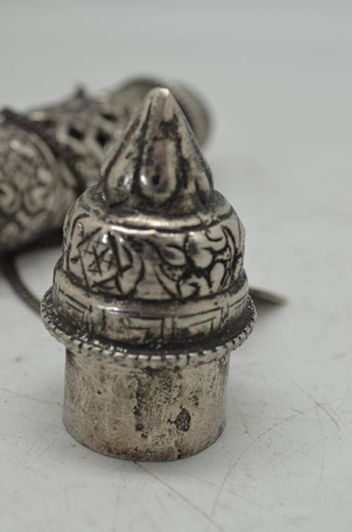 Intricately detailed, has a silver/pewter look to it, although I don’t know exactly what metal it is.