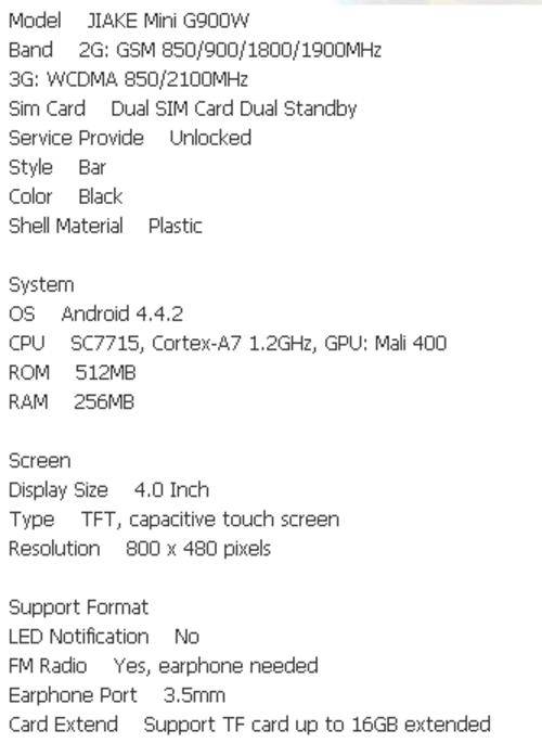 JIAKE G900W 4.0 Inch Android 4.4 Smartphone 1.2GHz Dual Card Dual Cameras 3G Bluetooth WIFI