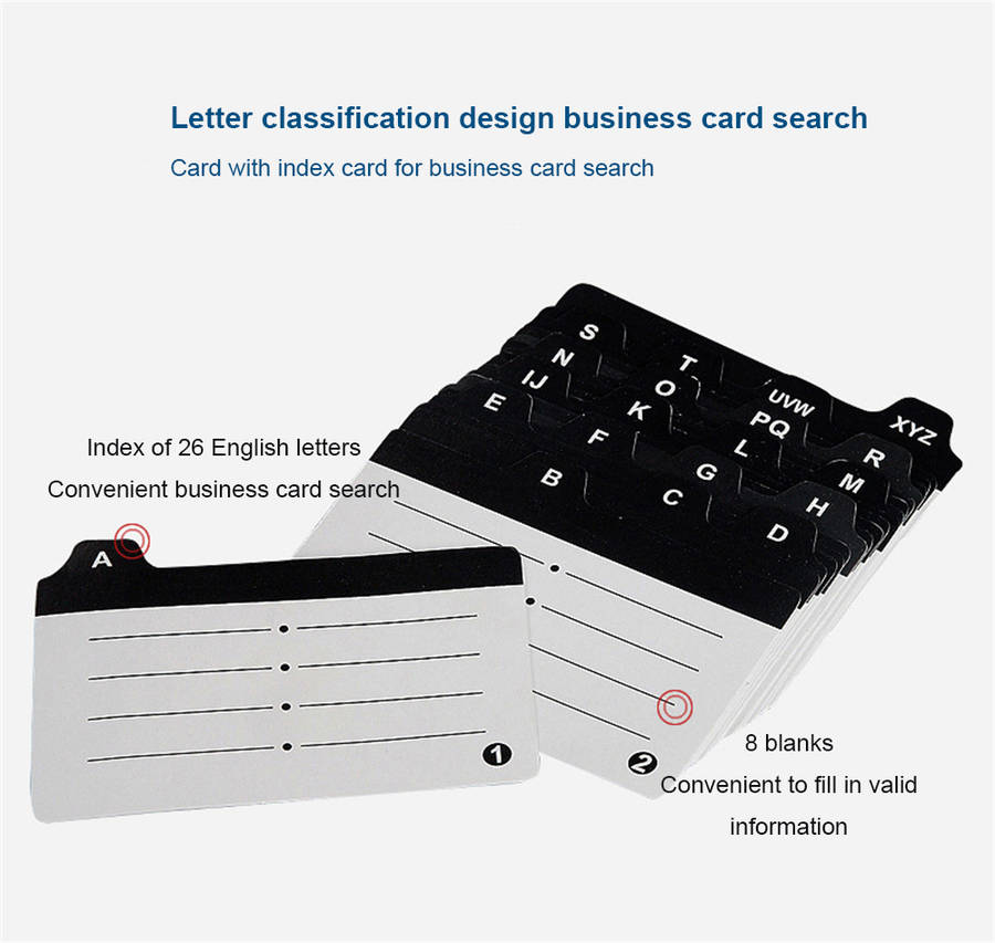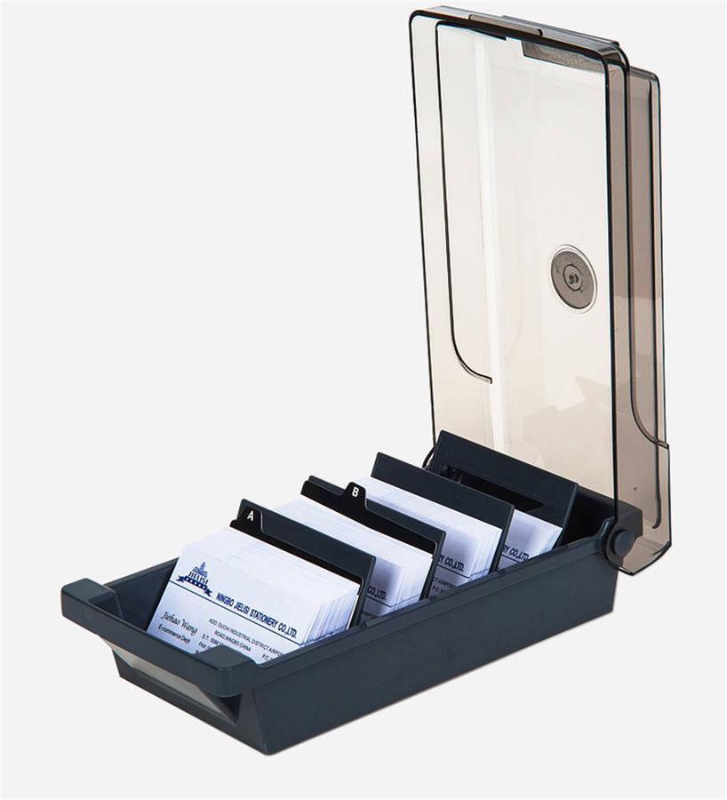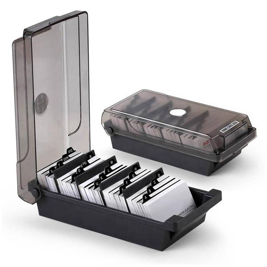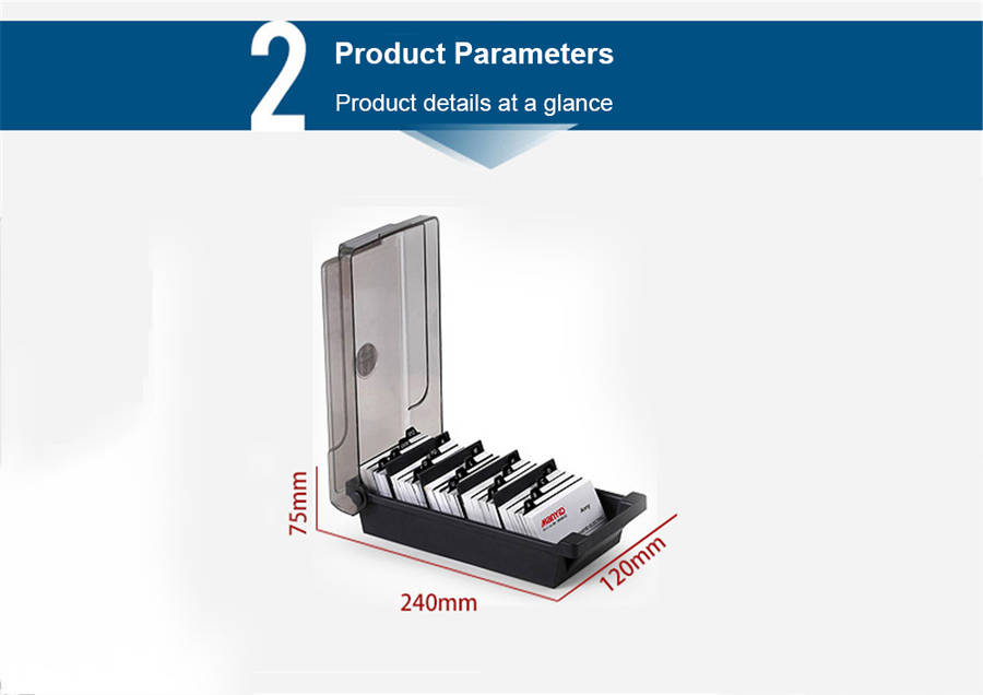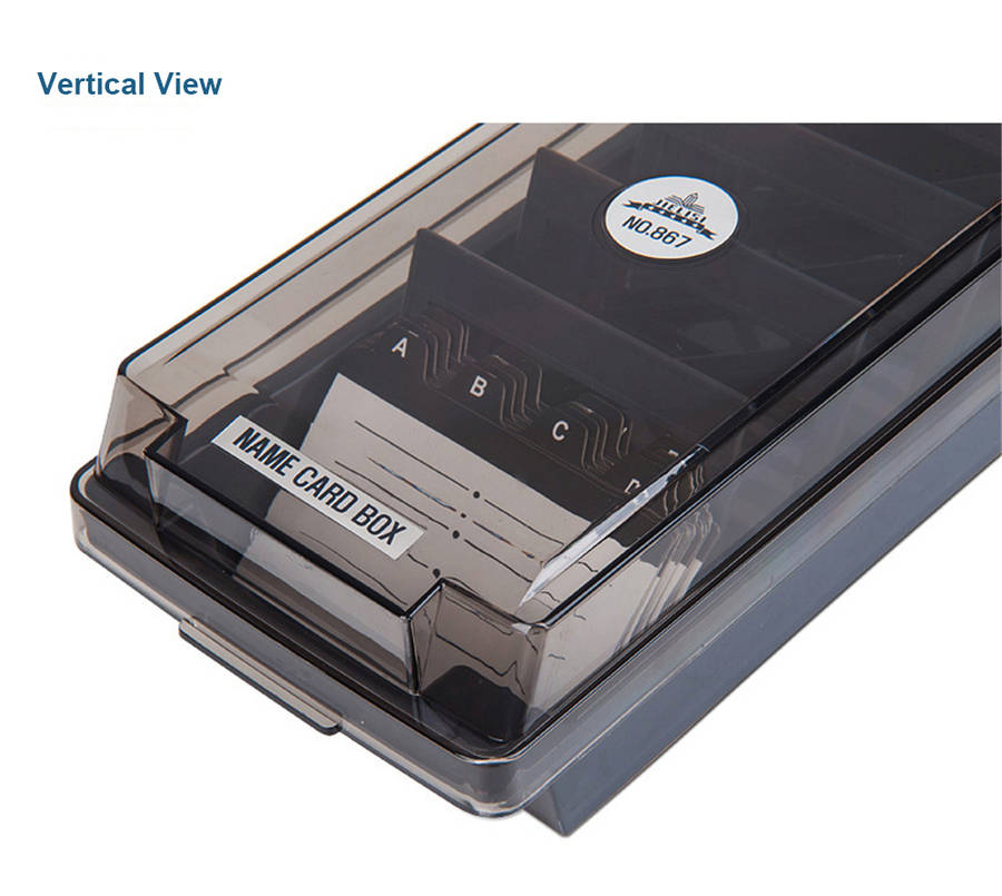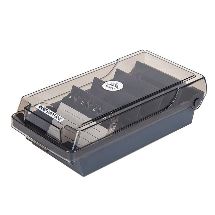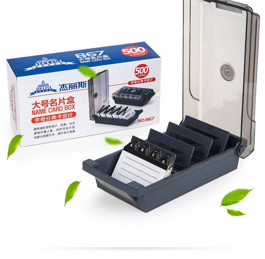 Features: a Excellent design, the lid opens easily and keeps away from dust. a Includes fixed dividers and 20 A-Z alphabetical index tabs for easy organization. a Perfect for storing and organizing business cards. a Durable ABS material, large capacity, convenient to use. a It can contain up to 500 standard size business cards. a Cardholders can organize desks or tables neatly and orderly, suitable for office and home use. a It can be placed in business offices, homes, schools, personal departments, travel agencies and most office spaces. Specifications: a Brand: JIELISI a Model: 867 a Material: Plastic a Size: 24*12*7.5CM a Material: Plastic a Color: As show Package includes: a 1 * Business Card Box Note: a Please allow slight deviation of measurement due to manual measurement. a Due to different producing batches, product details might be a little different. a Due to different monitors and different light, the picture may not reflect the actual color of the item. a Please consider the actual sizes shown in the listing as the pictures are generally enlarged to show detail.