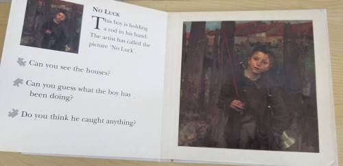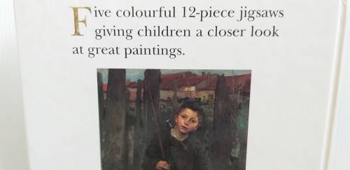 A board book with five 12-piece jigsaws of fine art paintings featuring children. Each jigsaw fills a right-hand page and can be pressed out of the page. The corresponding left-hand page includes a simple text. A gallery at the back of the book shows the full paintings with details of artists.