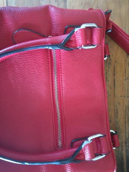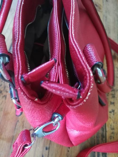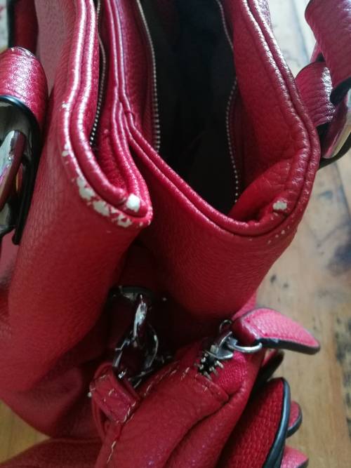The bag has been well used and shows some wear as can be see in the photographs - but this can be repaired with some red leather dye. The wear is not visible when the handbag is carried over ones shoulder as the area is under the arm.