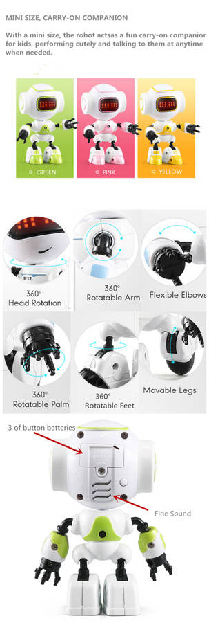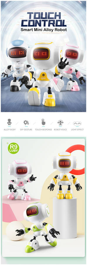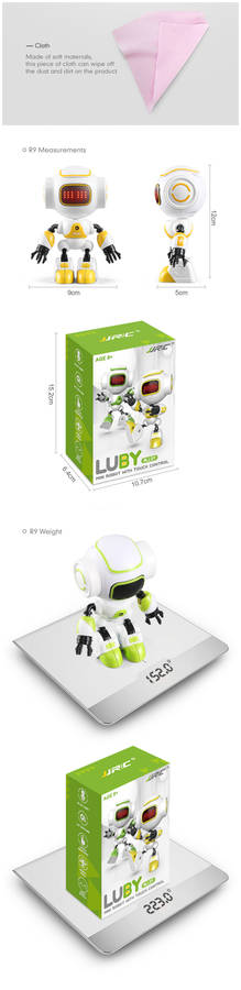 Package weight: 0.18 kg Description: Brand: JJRC Item: R9 Color: Yellow, Pink, Green Battery: 3*LR44 Button Battery(Included) Playing Time: About 60 Minutes Weight: About 152g Product Size: 9*5*12cm Package Size: 10.7*6.4*15.2cm Features: Touch sensitive to control the facial expression by the eyes LED, bring you a better operation experience. Can be use to the mobile phone holder, very practical. Can DIY its pose at anytime, bring you more fun. The toy robot is desiged with sound. Package: 1* JJRC R9 Toy Robot 3* LR44 Button Battery 1* Manual 1* AR Manual 1* Cleaning Cloth