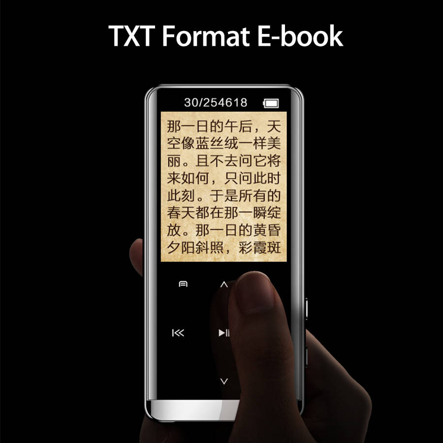 Features: Touch button night backlight, it is more convenient for night operation Support APE/FLAC and other lossless formats, support lyrics synchronization, background playing Support AMV/AVI video playing Hifi lossless sound quality, 5D sound TXT format e-book, memory reading Built-in dual PCM microphone to support long-distance recording Long battery life, charging for 1.5 hours, playing for 48 hours Support convenient folder classification The FM function can not only radio, but also record it and save it. One button lock screen, simple and convenient Support OTG downloader (requires mobile phone to support OTG function) bluetooth CSR4.2, better wireless sound quality