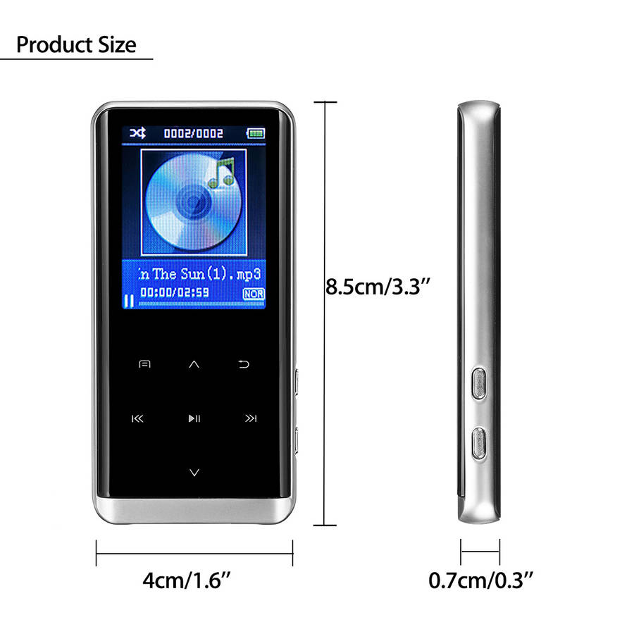 Specification: Name: Portable bluetooth MP3 player Model: M13 Material: CNC metal one, double curved glass screen Built-in memory: 8G/16G Resolution: 128 x 160 bluetooth version: CSRa 4.2 Battery power: 800mAh Frequency response: 20Hz-20KHz Charging time: About 1.5 hours Play time: 48 hours Reading time: 78 hours Distortion: <0.008% Recording format: MP3/WAV Play format: MP3/WMA/WAV/APE/FLAC Signal to noise ratio: >90db Size: 8.5 x 4 x 0.7cm / 3.3 x 1.6 x 0.3inch