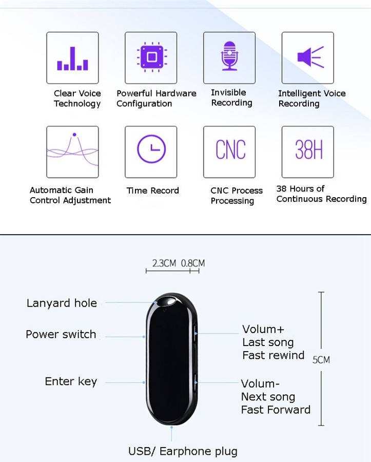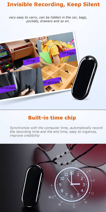 | Features Intelligent voice recording, record when have sound, pause when no sound Remote recording, no distance restrictions with HD sound quality Power off can save automatically With clear voice technology Can record up to 38 hours continually Can as a pendant to wear, invisible to record