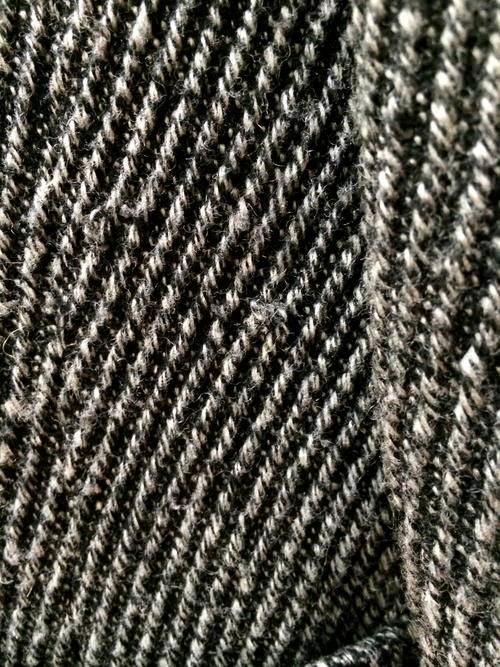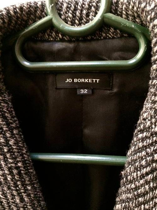Jo Borkett Jacket size 32. Tweed-like blackbrown/grey material. About 60cm from shoulder in length. Worn, but still in very good condition. Some threads have hooked here and there, but can be sewed away easily.