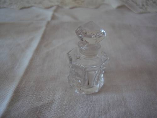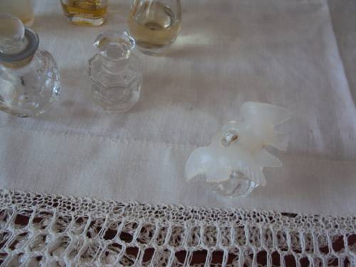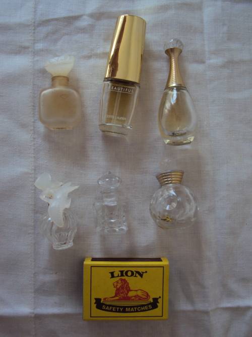 Collection of 6 x miniature glass perfume bottles, empty, one is mini glass L'Air du Temps kissing doves