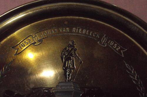 1652 JOHAN VAN RIEBEECK 1956. South Africas first commander. Presented by his worship The Mayor Councillor I.E.B.Attwell. Also written in Afrikaans. The plate is old so it has a few scratches and marks on. 18.5cm all round.