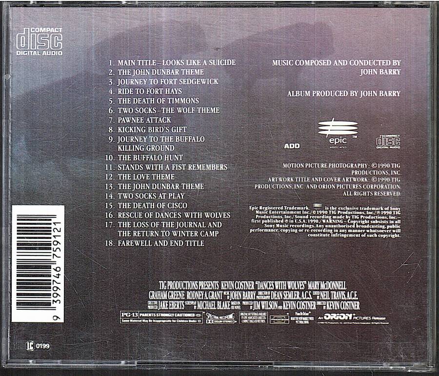 John Barry's fifth Oscar-winning score is a profoundly moving body of music, generally (though not entirely) elegiac in tone, very much like the movie for which it was written. It's also a bit of a mixed bag, occasionally falling back on material that will be familiar to fans of the James Bond movies that Barry scored during the early- to mid-'60s. The main title theme uses some of those devices -- dense, heavy string passages adjacent to trumpet calls -- but it is hardly representative of the full score. The real heart of Dances With Wolves is the pensive, tragic "John Dunbar Theme," which is far closer in spirit to Barry's music for Somewhere in Time or They Might Be Giants -- films (and scores) far removed from the Bond movies. It seems as though, when Barry is asked to write music for characters who are complex and troubled (Bond is neither), he delivers the goods in the guise of musical material that reflects those elements. Some elements familiar from the Bond films can be found scattered throughout this soundtrack, particularly in the violin-driven "stings" that open "The Death of Timmons" and the horn calls that herald its closing; in the string parts underneath the hyperactive percussion of "Pawnee Attack" that might've been lifted right out of From Russia With Love; and also in "Stands With a Fist Remembers," with its secondary violin part in the upper register of the strings. Much of Dances With Wolves, however, shows a broadening of Barry's sound -- he uses the vast canvas of Kevin Costner's movie and Dean Semler's cinematography as the basis for one of the most richly scored soundtracks of his career, working with one of the largest orchestras ever heard in one of his films; "Journey to Fort Sedgewick," "Kicking Bird's Gift," "Two Socks at Play," "The Death of Cisco," and "Journey to the Buffalo Killing Ground" have an almost Copland-like majesty about them, and "The Buffalo Hunt" is one of the finest pieces of music the man ever wrote. At times, it sounds as though Barry had every string and horn player in Los Angeles present, and topped it all out with an oversized percussion section, but none of the music or the scoring here sound excessive.