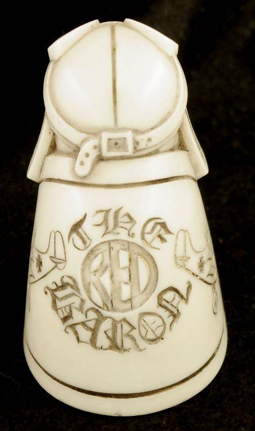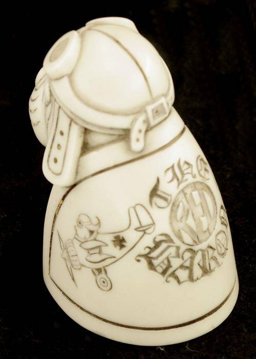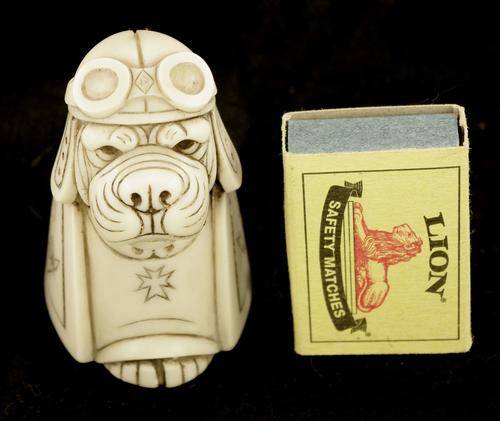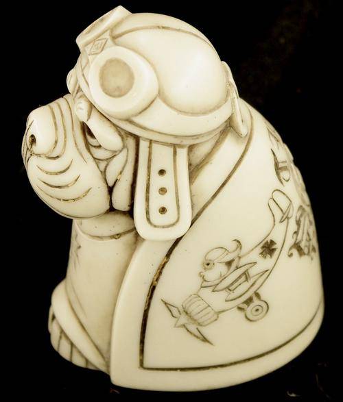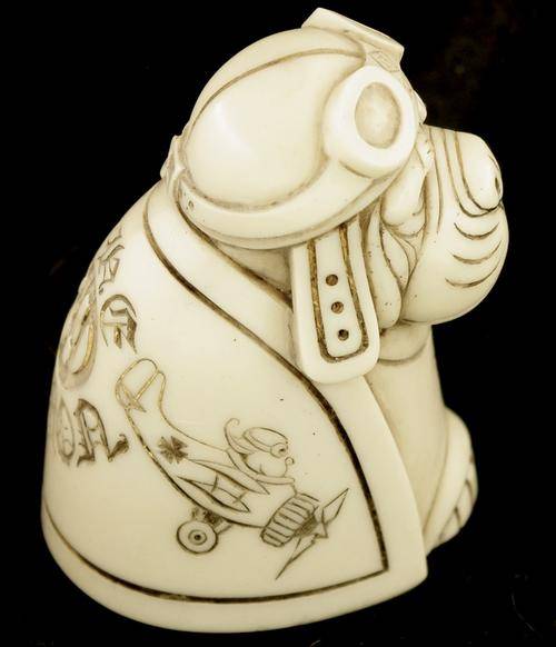 John Biccard was a renowned South African artist from Capetown who worked with crushed marble. He passed away in 2006. Figurine is ivory colored with black details.Obviously Biccard made these to look like real Ivory. This figurine is quite heavy considering its size. He stands approx 8cm high and has a depth of just over 6cm and a width of approx. 4.5cm. The artists initials are on each piece. Every one of John Biccard's pieces was hand finished. This (see photos) Bulldog is dressed as the famous "Red Baron". He is beautifully detailed. The folds on the dogs face are remarkable. Any collector of dog and animal miniatures will appreciate this really interesting figural piece. General Bulldog would make a fine addition to your porcelain, metal or glass display objects. Bakelite collectors may find this piece interesting as well. A perfect addition to display on your etagere. Mr. Biccard created many really lovely, whimsical pieces These unique, lovely creations would make wonderful holiday, mens or womens birthday presents or add a lot of value to your own collection. These editions are obviously very limited and therefore quite scarce.