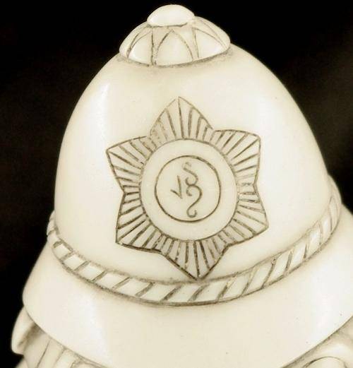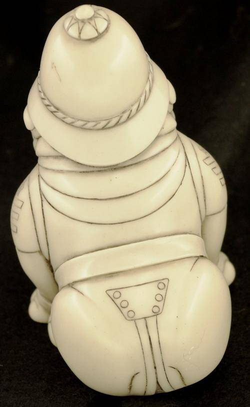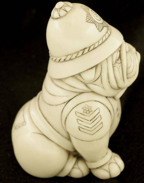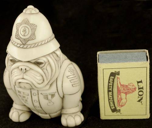 John Biccard was a renowned South African artist from Capetown who worked with crushed marble. He passed away in 2006. Figurine is ivory colored with black details.Obviously Biccard made these to look like real Ivory. This figurine is quite heavy considering its size. He stands approx 10cm high and has a depth of just over 7cm and a width of approx. 6cm. The artists initials are on each piece. Every one of John Biccard's pieces was hand finished. This (see photos) Bulldog is dressed in a military costume (general?) fitted out with medals. He has a very smug, self important demeanor and is obviously used to being obeyed. You can see how much detail went onto this piece to make it so dimensional. The folds on the dogs face are remarkable. Any collector of dog and animal miniatures will appreciate this really interesting figural piece. General Bulldog would make a fine addition to your porcelain, metal or glass display objects. Bakelite collectors may find this piece interesting as well. A perfect addition to display on your etagere. Mr. Biccard created many really lovely, whimsical pieces These unique, lovely creations would make wonderful holiday, mens or womens birthday presents or add a lot of value to your own collection. These editions are obviously very limited and therefore quite scarce.