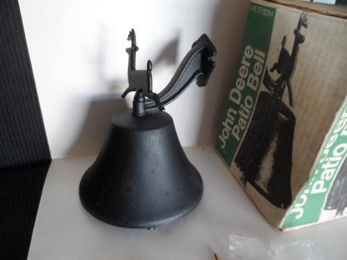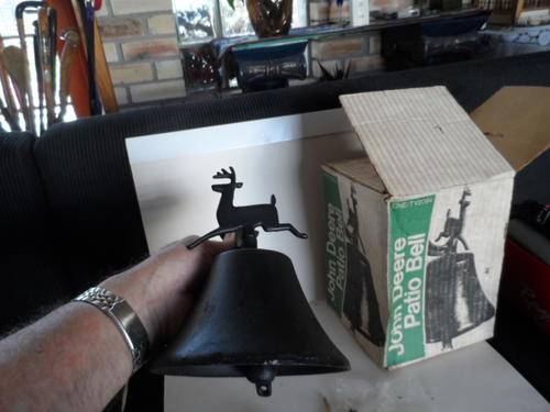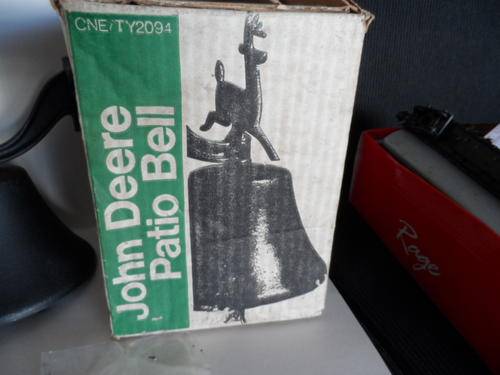 JOHN DEERE PATIO BELL EXCELLENT BOXED CONDITION. COMPLETE WITH UNUSED LEATHER THONG FOR BELL CLAPPER AND MOUNTING SCREWS. A MOST UNUSUAL ITEM NEVER SEEN WITH ITS ORIGINAL BOX.