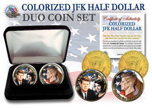 THIS IS A GENUINE LEGAL U.S. TENDER JFK HALF DOLLAR COIN SET with JACKIE O and LITTLE JOHN JOHN. The front of the 1st coin has been fully colorized with one of the most poignant images in Amercian History (JFK JR., as a little boy, saluting his father during his burial and his wife, Jackie Onassis, looking as beautiful as ever). The front of the 2nd coin has been fully colorized to exact detail of the original coin design with a American flag background and the famous words "Ask What You Can Do For Your Country"