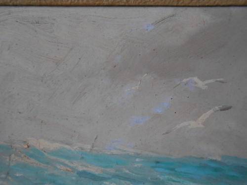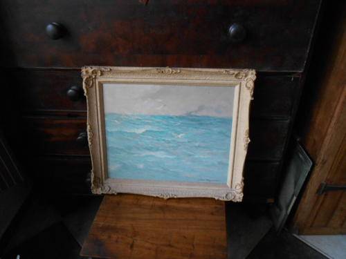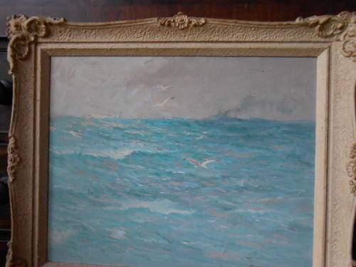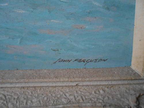 A N ATTRACTIVE OIL ON BOARD IN ORNATE FRAME. SUBJECT IS SEA SCAPE WITH SHIP ON HORISON AND FLYING GULLS . SEA AS ONLY THE ARTIST JOHN FERGUSON CAN PAINT IT. FRAME MEASURES 63CM. WIDE AND 53CM. TALL. NOTE LIGHT BLUE PATCHES ON SKY AS SHOWN IN PHOTO. PLEASE NOTE BUYER TO ARRANGE COLLECTION AT OWN COST AS WE DO NOT HAVE A COURIER SERVICE.