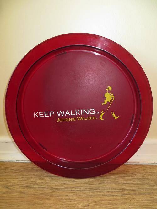 FANTASTIC COLLECTABLE JOHNNIE WALKER SCOTCH WHISKEY, KEEP WALKING RED AND GOLD COLOURED PLASTIC TRAY.