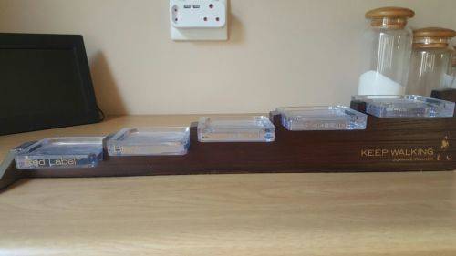 - EACH GLASS STAND IN THE WOODEN FRAME HAS THE JOHNNY WALKER VARIETY NAME ON IT -