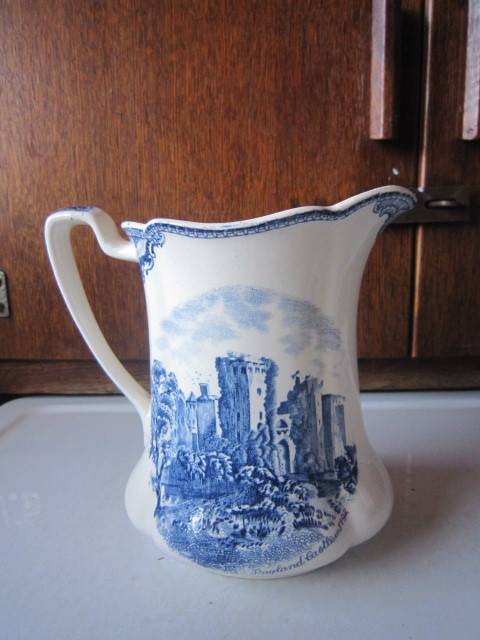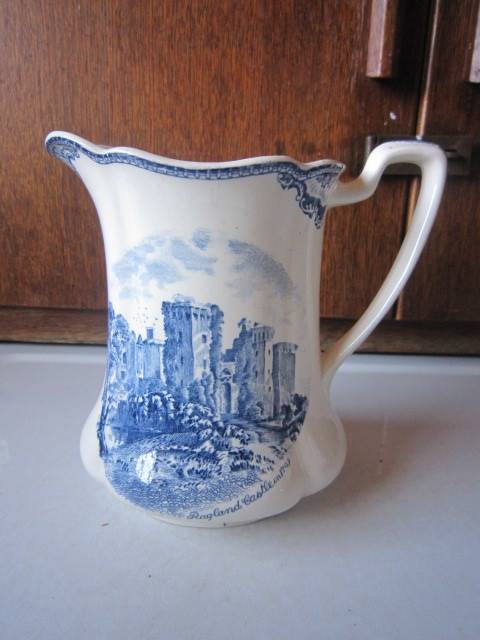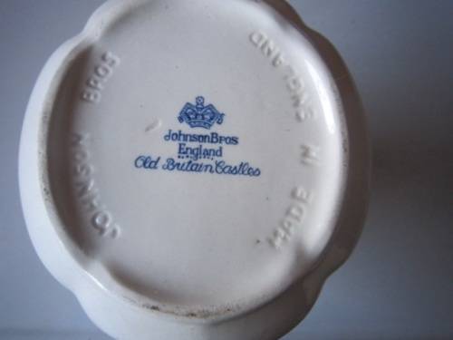 Lovely large Johnson Bros, England, Old Britain Castles water jug in totally brilliant condition. I cannot see any crazing or discolouration whatsoever. This is one of the older pieces and the picture is of Ragland Castle 1709 and will make a lovely addition to your blue and white collection. 16cms high, 17cms long and approx 14cms wide, postage will be 75.00.