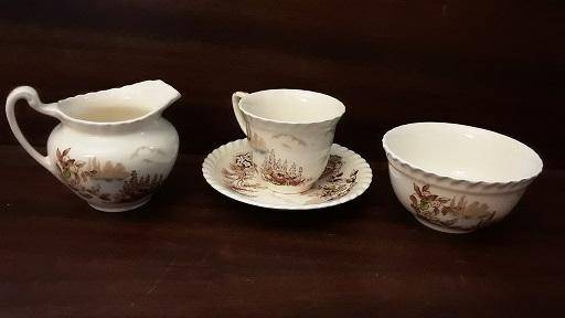 Johnson Bros England Castle on the Lake Four Piece sugar , milk pots and small cup , saucer