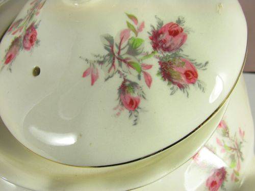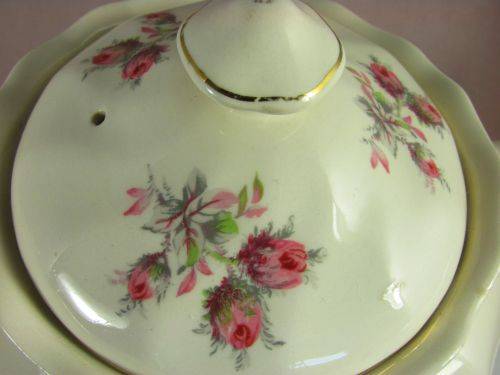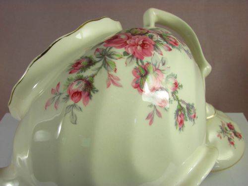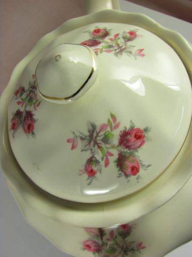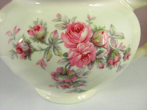 On offer is a lovely 'Old Chelsea' teapot from Johnson Bros. It has the characteristic swirls of this design with gold trim and lovely swatches of pink roses with green foliage.