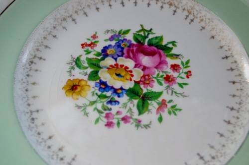 Very pretty floral centre, aqua band, rope rim and gilt accents
