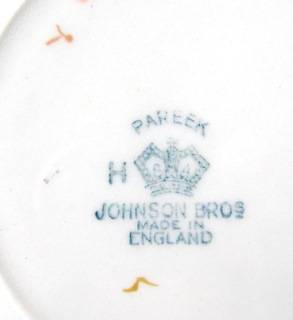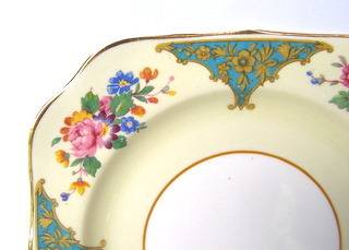 A Johnson teaplate in the Pareek design, showing small bunches of flowers set within turquoise and gold cartouches and all on a pale yellow ground. The rims are also trimmed with gold gilt.