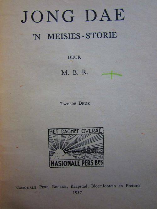 tweede druk 1937 hardeband 224 bladsye, die hardeband is verweer soos te sien op die foto, naam voor in boek, die potlood merkie wat u sien op die een foto is uitgevee,die teks is skoon en die binding goed, versending R25 in RSA - geen oorsese versending