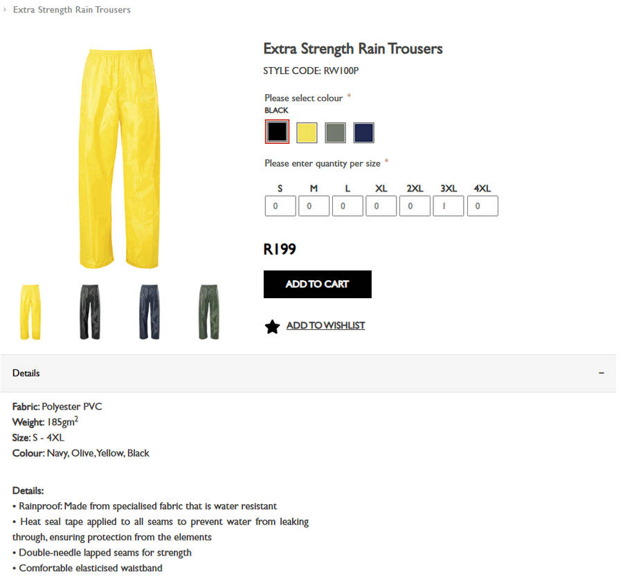 R35.00 Standard shipping using one of our trusted couriers applies to most areas in South Africa. Some areas may attract a R30.00 surcharge. This will be calculated at checkout if applicable. Check my rate