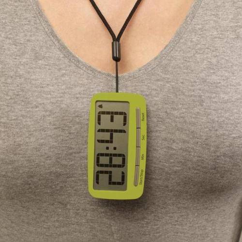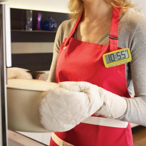 Features a strong clip attaching to any apron or cloth, a long cord for hanging around your neck, a magnet on the back for mounting onto a refrigerator or oven door and a support at the back for standing on a work surface.