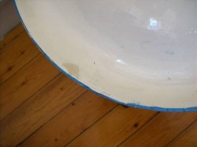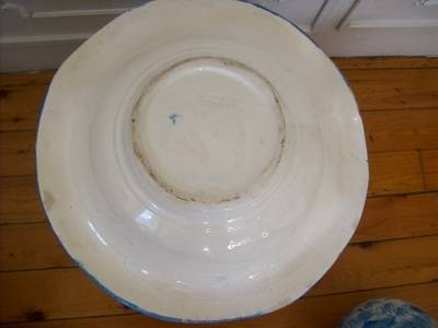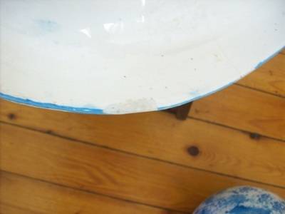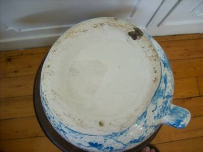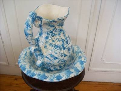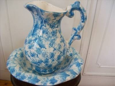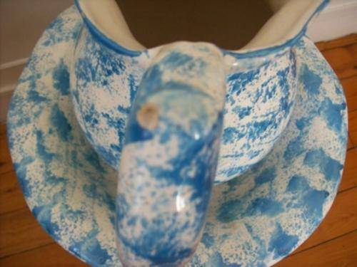 A porcelain jug and bowl, nicely patterned in blue and white, in good condition, there are a few places on the bottom where the enamel of the paint has worn off, but this is not noticeable nor does it detract from the item. There is a little chip on the handle. The measurements are bowl 70mm high 350mm dia, jug 310mm high.