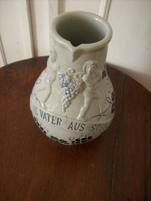 A lovely jug wine or beer made in Germany with German writing on  it which I cant decipher, it measures 150mm high,