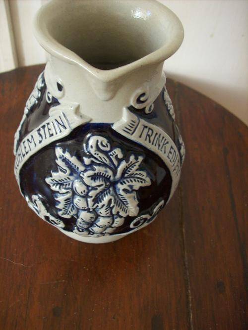 A lovely wine/beer jug made in Germany with German writing on it that I cannot decipher, measures 150mm high, it is in good condition.