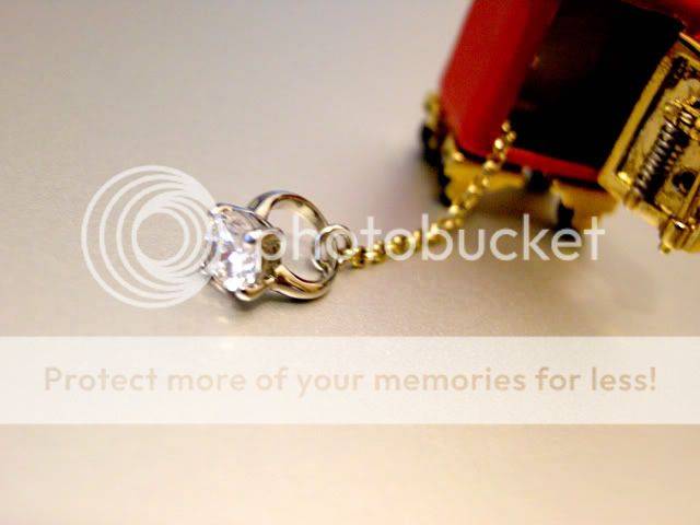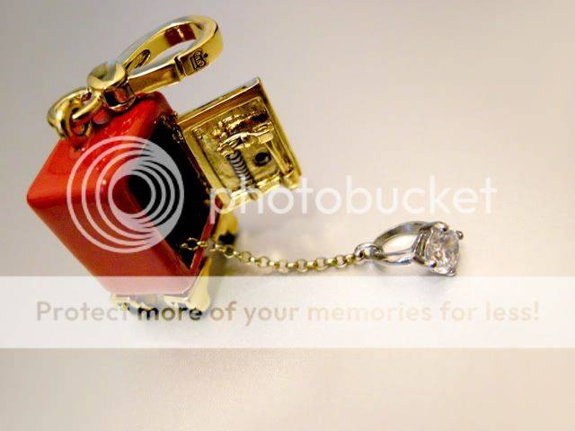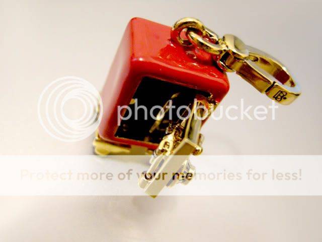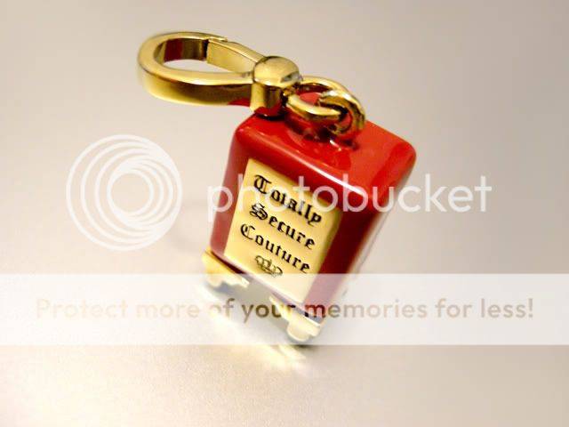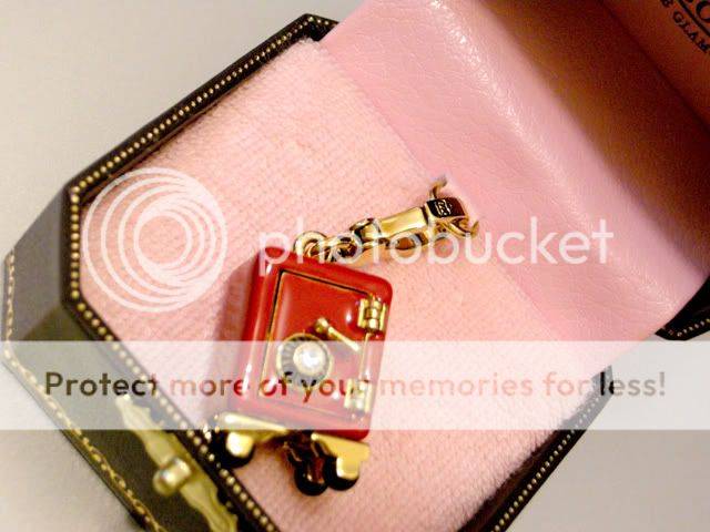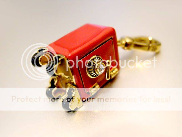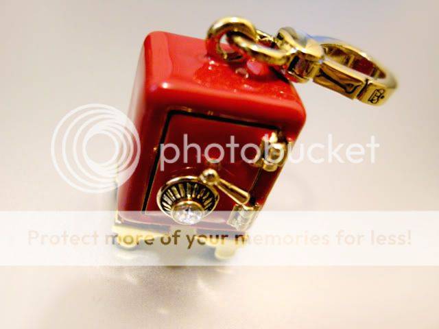 Measuring approximately 1 cm (W) x 1.5 cm (L) x 2.7 cm (H) (not including the clasp which is around 2 cm in length), this lovely charm, which can be used with any bracelets/necklaces (including your Juicy Couture ones of course), is made of 14K yellow gold-plated brass, silver-tone metal, red enamel, pave crystals and plastic wheels. The body of the safe is in red enamel. A large sparkling pave crystal is neatly set on the turn-able dial on the safe door. Once the safe door is open, you will see a silver-tone 'diamond' ring attached to a thin gold chain which is firmly affixed to the left-hand corner inside the safe. The safe charm comes with 4 wheels, which allows the safe to actually roll around, and a 14K yellow gold-plated lobster clasp closure.