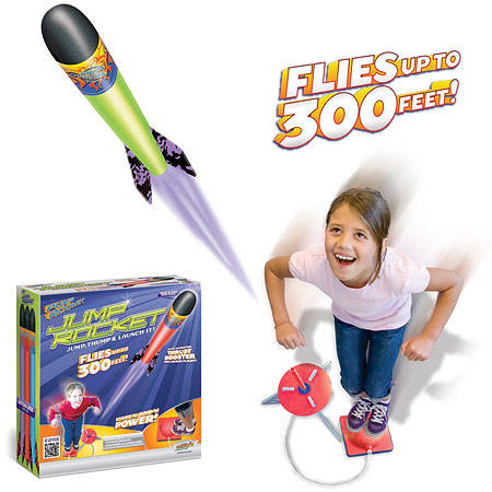 Jump it up. Thump it up. Way up. How far? How about the height of a 15-story building. Simply slide the safe, foam jump rocket onto its launching pad, jump up and land on the hemisphere-shaped air pump, and watch it blast off, to a height of up to 150 feet. It couldn't be easier, simpler or more FUN.