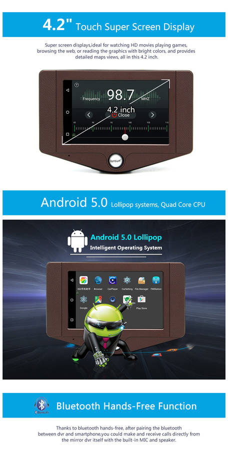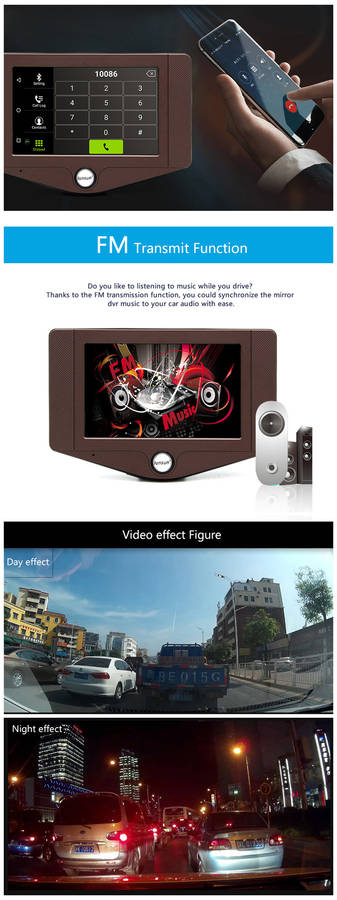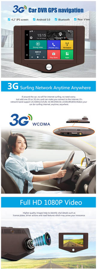 Feature:1. 4.2 inch Dual lens Touch Screen Display This dvr support Dual lens video display. It also provides instant video playback. Prove your innocence in seconds whilst
