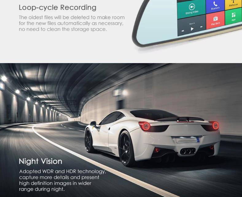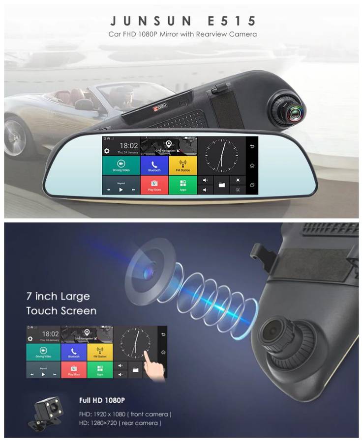 | General | Brand: Junsun Model: E515 Type: Car DVR with Rearview Mirror Chipset: MTK6735 Image Sensor: CMOS Features: HD,Wireless Function: Anti-Shake,Auto-Power On,Bluetooth,Delay Shutdown,G-sensor,GPS,HDR, Loop-cycle Recording,Motion Detection,Night Vision,Parking Monitoring,Time Stamp,WDR,WiFi |