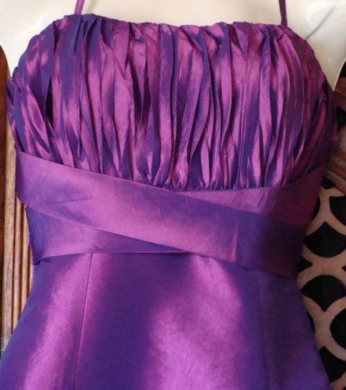 Finely pleated bust with crossed under bust detail and shoe-string straps.