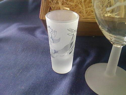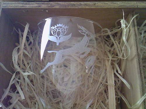 For your lady there is a white wine glass with frosted stem, which measures 14cm in height, with etched Protea, Springbok and rugby ball.