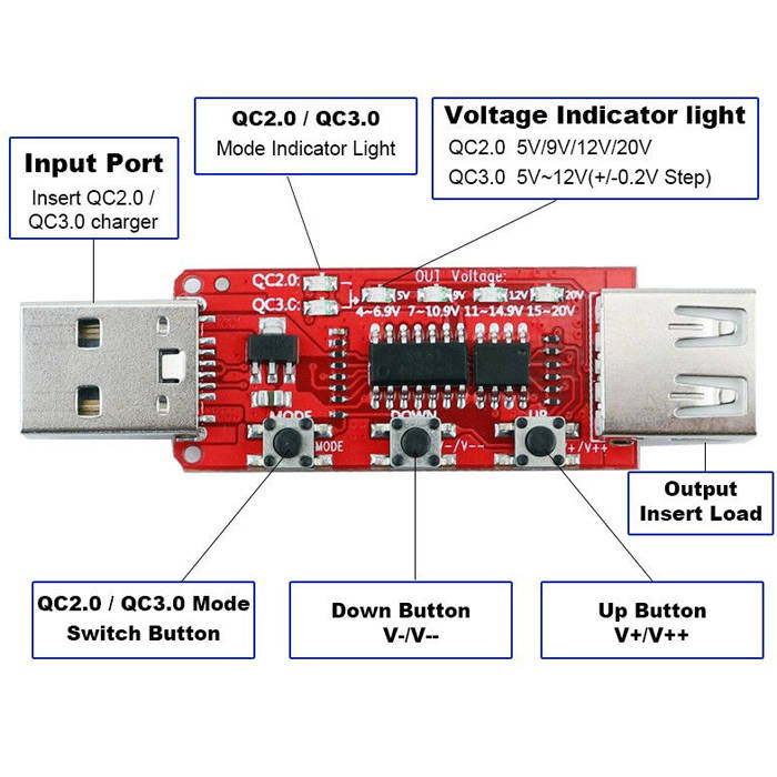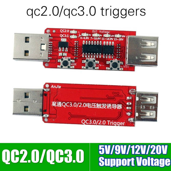 Specification: USB female port output. QC 2.0 5V/9V/12V trigger voltage. Supports Manual mode and Auto mode. Manual mode: Short press for trigger voltage switch. Auto mode: Long press enter auto mode, trigger voltage will repeat in the sequence of 5V to 9V to 12V. For test charger and power bank that support QC2.0 output. Package included: 1 x QC 2.0 test board Detail Pictures: ![]() ![]() ![]() ![]() ![]() ![]() |
