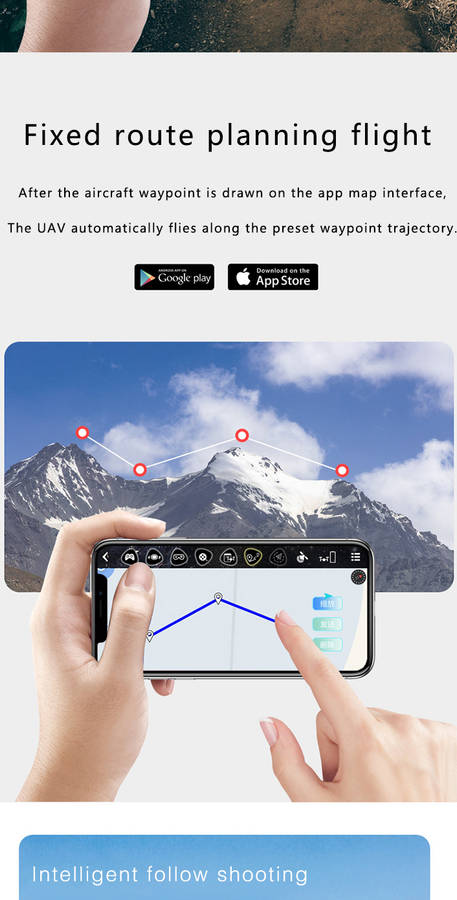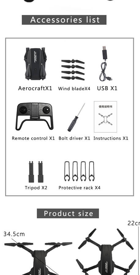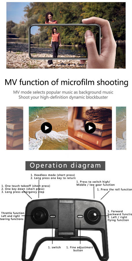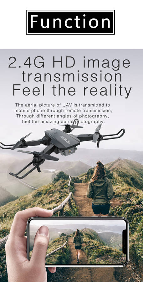 Function: Up/down, Forward/backward, Turn left/right, Sideward flight, 3-level flight speed, LED Light, Headless Mode, One Key Automatic Return, Altitude Hold Mode, WiFi FPV