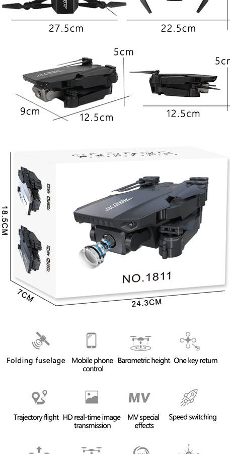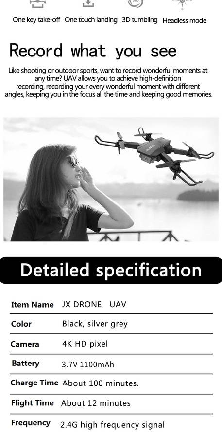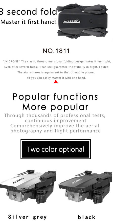 Package weight: 0.20 kgJX 1811 WiFi FPV with 4K HD Wide Angle Camera High Hold Mode Foldable RC Drone Quadcopter RTFDescription:Brand Name: JX