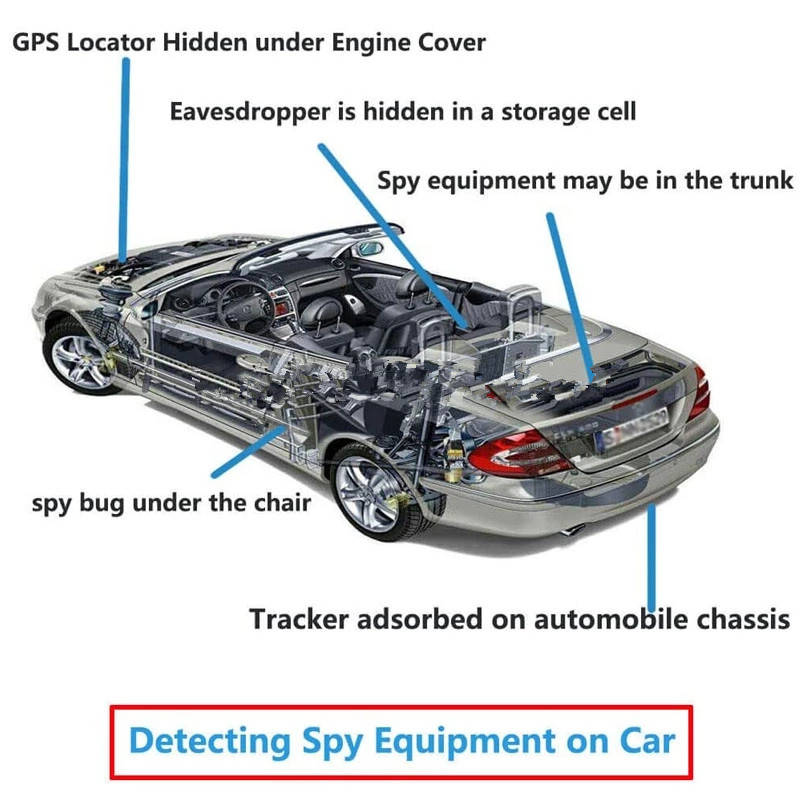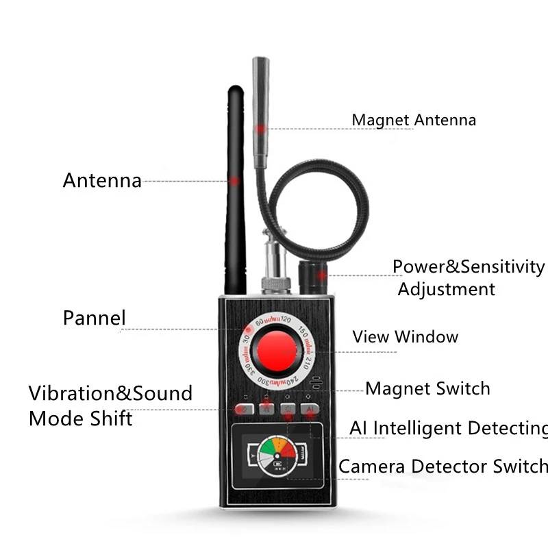 Function: Able to detect SIM card (2G, 3G, 4G) bugs/GPS trackers Able to detect wireless camera equipment from 1.2G a?? 5.8G Able to detect covert equipment put on standby mode Easy to operate/carry Uses sound, light, and vibrations to alert users to the hidden device Able to detect radio waves, magnetic fields, and wired/wireless cameras