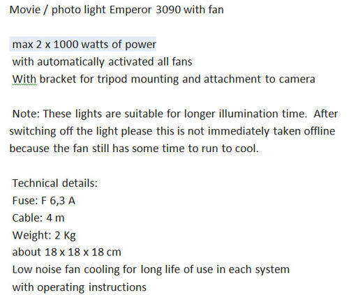 Kaiser 3090 2 x 1000 W / Movie / photo light Emperor with fan, brand new.