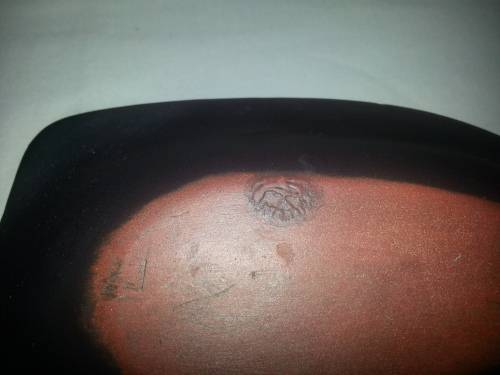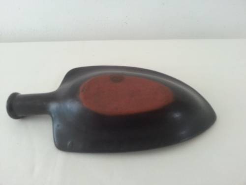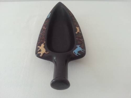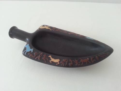 Offered for sale is a stylish, midcentury modern Kalahari studio pottery platter/shallow bowl made in the Cape in the early 1950's. It is a hand made and decorated item shaped to emulate a short spear or arrow head with a cylindrical handle . The platter is made from red bodied clay, glazed in a black satin glaze. The border has a scrolling motif of Bushmen hunters and antelope raised in shallow relief and picked out in bright turquoise, vanilla and rust . The design is by husband and wife team Aleksanders and Elma Klopcanov expatriate Latvians who emmigrated to South Africa in the 1940's