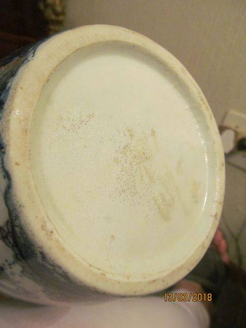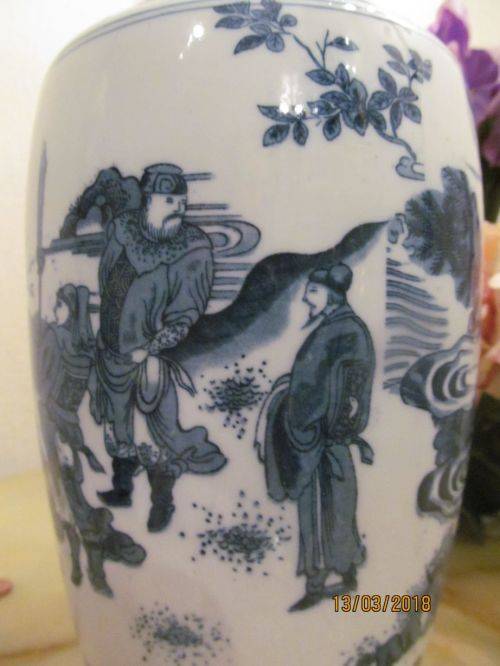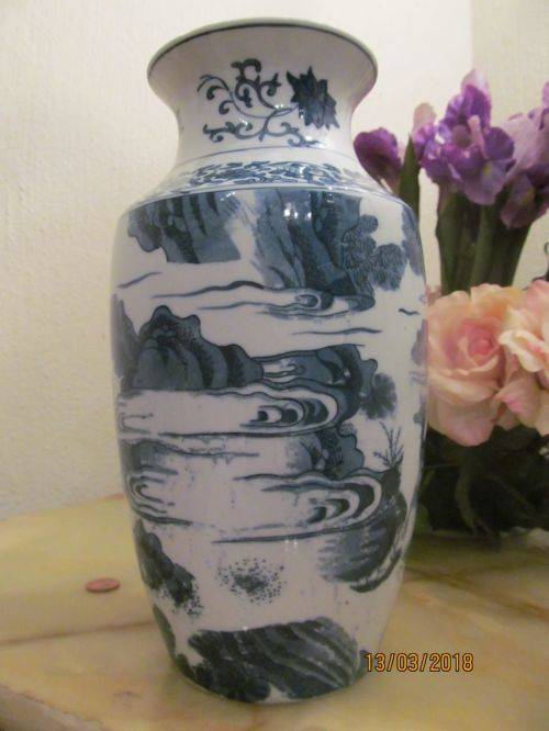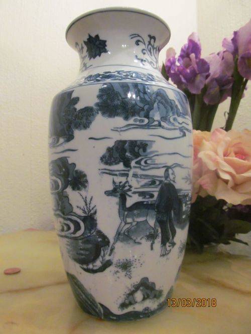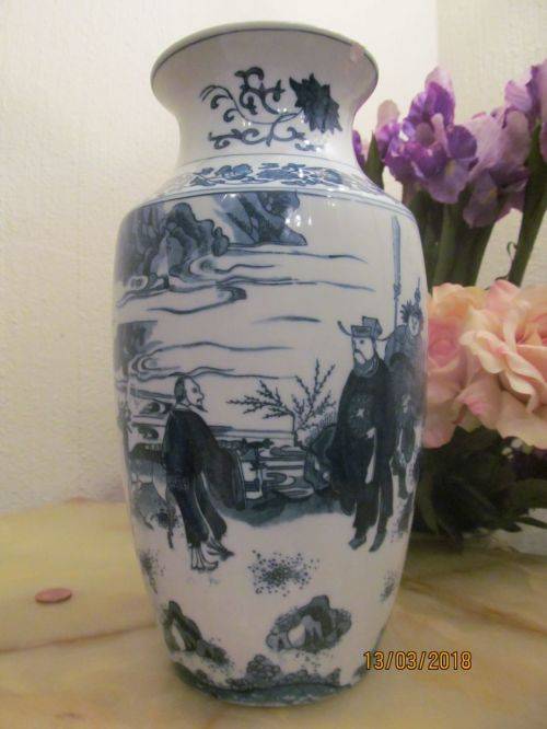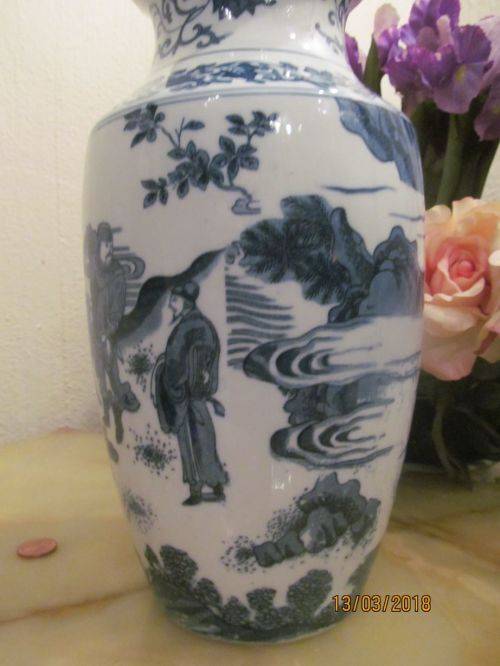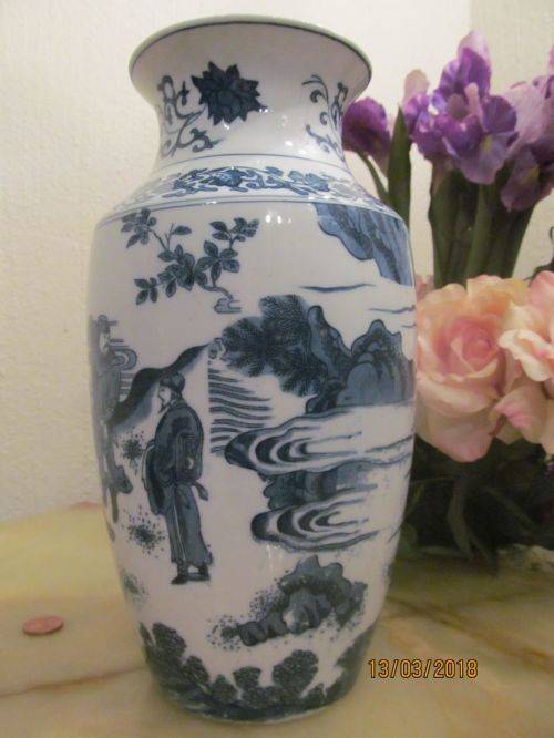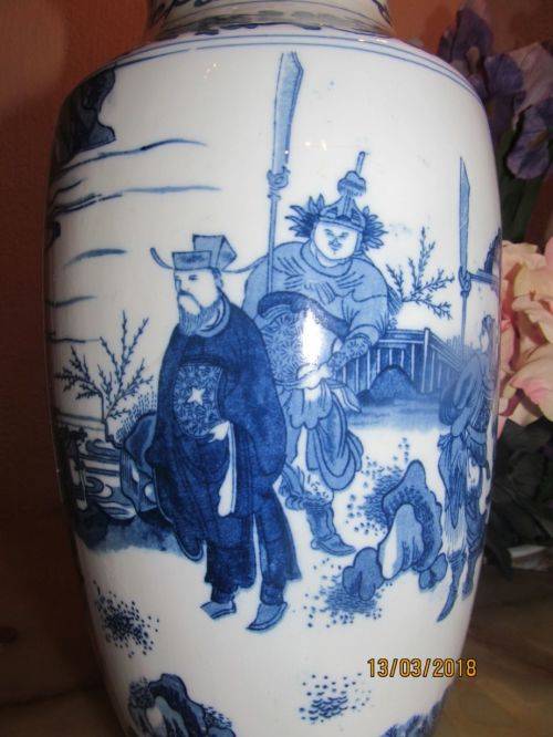 ALTHOUGH THIS REMARKABLE PORCELAIN VASE IS VINTAGE AND NOT FROM THE KANGXI PERIOD AT ALL, IT IS BEAUTIFULLY DECORATED IN BLUES ON A WHITE BACKGROUND IN A MANNER THAT CLOSELY RESEMBLES THE PERIOD. THE DECORATION DEPICTS A MAGNIFICENT LANDSCAPE WITH MOUNTAINS, RIVERS AND FOLIATE WHILE PORTRAYING SAMURAI WARRIORS CONVERSING WITH CHINESE NOBLEMEN. THE NECK AND SHOULDER OF THE VASE HOWEVER ARE METICULOUSLY DECORATED IN VINE AND FLORAL PATTERNS ALONG WITH BLUE TRIM. CLOSE INSPECTION OF THE VASE REVEALS IT TO BE HAND PAINTED AND HAND MADE