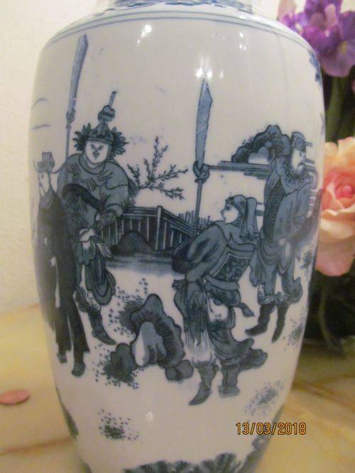 VINTAGE CHINESE PORCELAIN VASE DEPICTING CHINESE SAMURAI WARRIORS AND LANDSCAPE IN THE KANGXI PERIOD BLUE AND WHITE STYLE